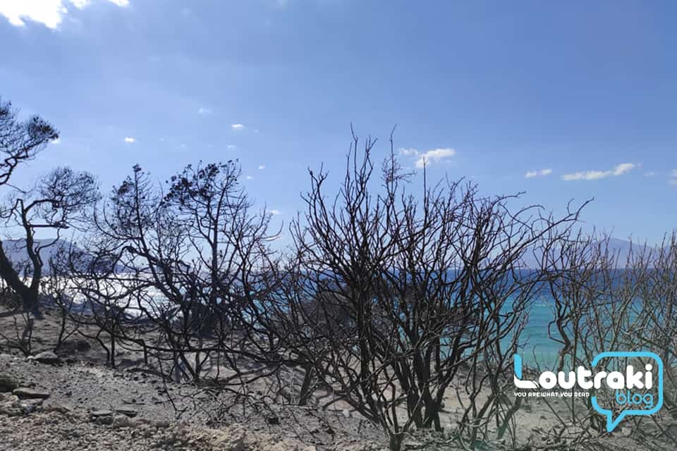 Εν τω μεταξύ, οι εικόνες από το τοπικό μέσο loutrakiblog δείχνουν το μέγεθος της καταστροφής στον Σχίνο, εκεί όπου ξεκίνησε η πυρκαγιά. Το παρθένο δάσος που έφτανε μέχρι τη θάλασσα έχει γίνει στάχτη, οι ακρογιαλιές μοιάζουν στοιχειωμένες χωρίς τη σκιά των δέντρων.