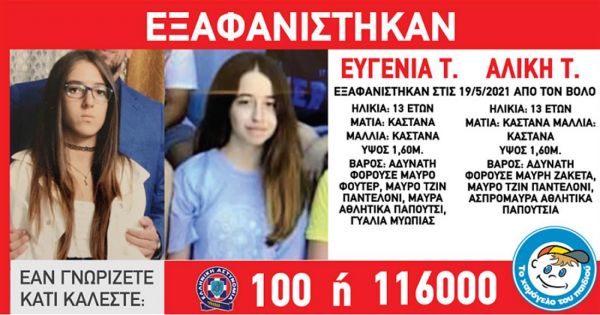 Η 13χρονη Ευγενία και η επίσης 13χρονη Αλίκη εξαφανίστηκαν από το σπίτι τους στο Βόλο, σύμφωνα με την ανακοίνωση από το Χαμόγελο του Παιδιού, που έδωσε στη δημοσιότητα τις φωτογραφίες, τα στοιχεία και τα ρούχα που φορούσαν με την ελπίδα όποιος τις έχει δει, να επικοινωνήσει με την οργάνωση ή τις Αρχές.