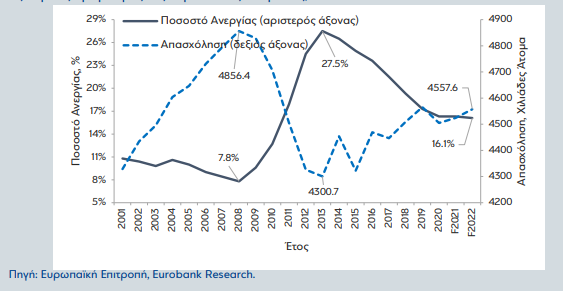 Η τράπεζα σημειώνει ότι η διαρθρωτική ανεργία έχει υψηλή συμμετοχή στο τρέχον ποσοστό ανεργίας στην Ελλάδα. Αυτό σε έναν βαθμό αντανακλάται στο μεγάλο, πλην όμως μειούμενο τα τελευταία χρόνια, ποσοστό μακροχρόνια ανέργων (66,5% του συνόλου των ανέργων το 2020 από 73,6% το 2014).