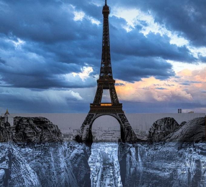 Μια καλλιτεχνική εγκατάσταση δημιούργησε μια οπτική ψευδαίσθηση και ο Πύργος του Άιφελ στο Παρίσι μοιάζει να είναι σκαρφαλωμένος πάνω από ένα βραχώδες φαράγγι.
