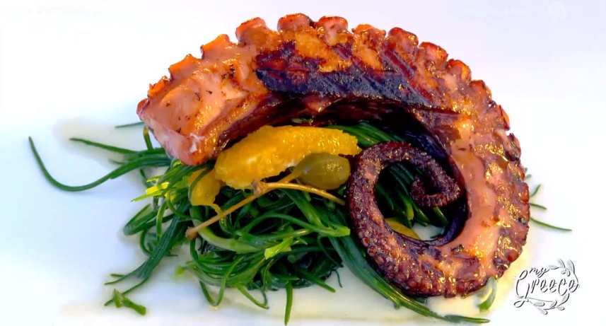 Στη μαγευτική Καρδαμύλη οι τρεις τους ετοίμασαν μια σαλάτα με αλμυρίκι, ταραμά και χταποδάκι.