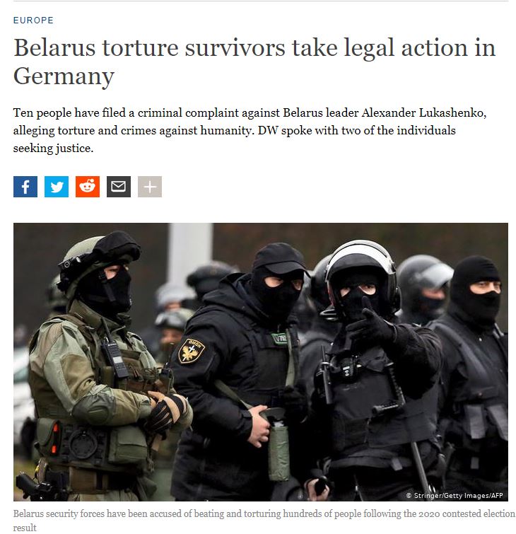 Τα Ηνωμένα Έθνη έχουν καταγράψει σχεδόν 450 περιπτώσεις βασανιστηρίων στη Λευκορωσία από τον Σεπτέμβριο. Δέκα θύματα που κατάφεραν να ξεφύγουν από το καθεστώς έχουν ξεκινήσει νομική προσπάθεια κατά του Λουκασένκο στη Γερμανία.