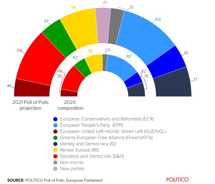 Πράγματι, όπως φαίνεται, η ισχυρότερη σήμερα πολιτική ομάδα, το Ευρωπαϊκό Λαϊκό Κόμμα (με πρόεδρο τον Ντόναλντ Τουσκ), θα έβλεπε τα μέλη της να μειώνονται από 187 σε 159. Έτσι, παρά το γεγονός ότι μειωμένη εμφανίζεται και η δύναμη των Σοσιαλιστών και Δημοκρατών, οι οποίοι θα έχαναν 10 από τις 146 έδρες που διαθέτουν, η διαφορά ανάμεσα σε πρώτο και δεύτερο θα μειωνόταν σημαντικά.