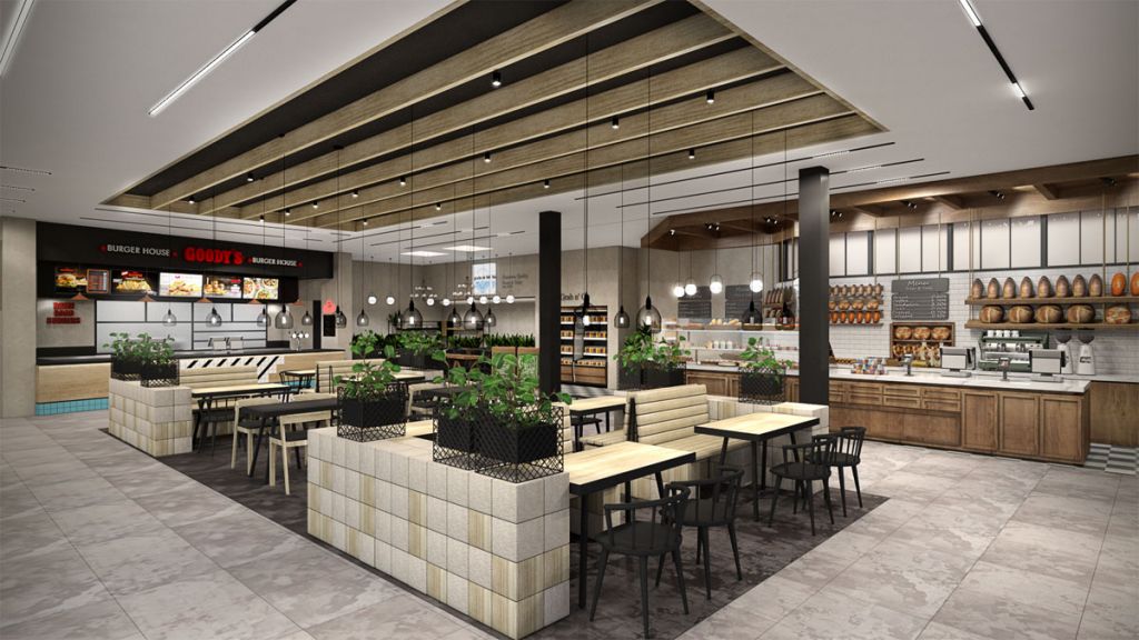 Φωτορεαλιστική απεικόνιση του ρεύματος καθόδου στα ΣΕΑ Σχηματαρίου: Ένα ολοκαίνουργιο Goody’s Burger House και το boulangerie Grain de Ble.