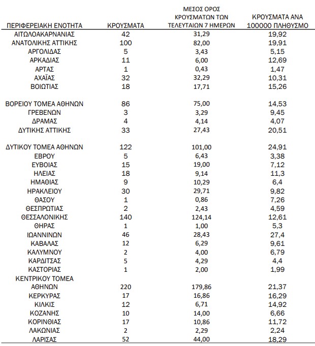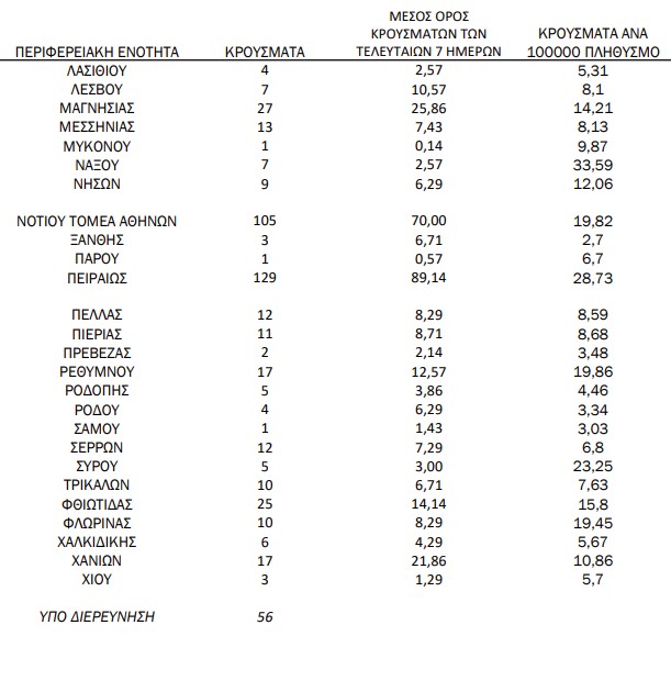 Τέλος, Δυτική Αττική και νησιά του Αργοσαρωνικού καταγράφουν 33 και 9 κρούσματα αντίστοιχα.