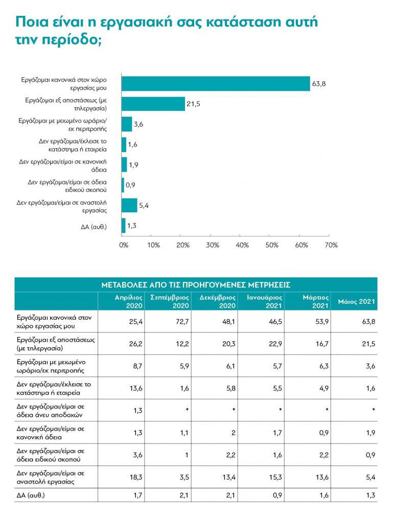 Σχεδόν 2 στους 3 Έλληνες εργάζονται κανονικά με φυσική παρουσία στον χώρο εργασίας τους (63,8%, από 53,9% τον περασμένο Μάρτιο και μόλις 25,4% τον Απρίλιο του 2020, εν μέσω του πρώτου lockdown), ενώ 1 στους 5 εργάζονται ακόμη με τηλεργασία.