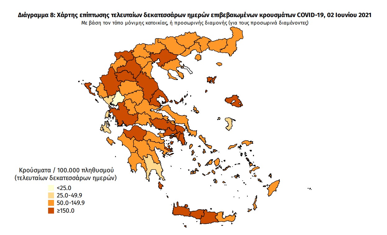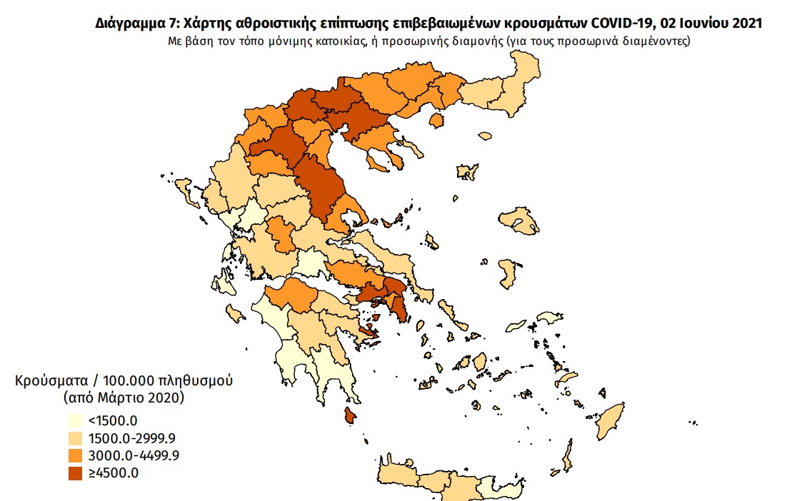 Ο χάρτης αποτυπώνει τη γεωγραφική κατανομή των συνολικών κρουσμάτων COVID-19 (από την αρχή της επιδημίας) ανά Περιφερειακή Ενότητα της χώρας, με βάση την δηλωθείσα διεύθυνση μόνιμης κατοικίας του ασθενούς, ή τη διεύθυνση προσωρινής διαμονής για τους τουρίστες και άλλους προσωρινά διαμένοντες στην Ελλάδα. Συμπεριλαμβάνονται τόσο κρούσματα με ιστορικό ταξιδίου (“εισαγόμενα”) όσο και κρούσματα με πιθανή εγχώρια μετάδοση.