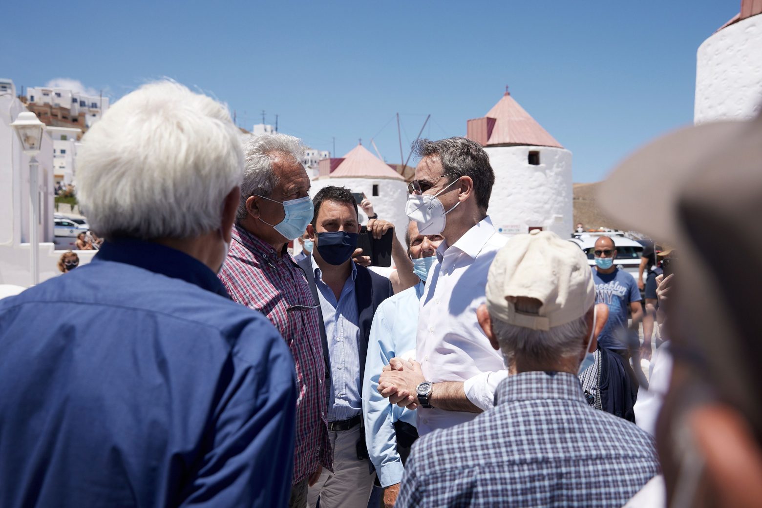 Στη συνέχεια ο Κυριάκος Μητσοτάκης, συνοδευόμενος από τον Δήμαρχο του νησιού, Νίκο Κομηνέα, περπάτησε στην περιοχή του ιστορικού Κάστρου, στη Χώρα, επισκέφθηκε τους περίφημους ανεμόμυλους, που έχουν κηρυχθεί ιστορικά διατηρητέα μνημεία και αποτελούν αναπόσπαστο στοιχείο του παραδοσιακού συστήματος καλλιέργειας δημητριακών στο νησί, ενώ συνομίλησε με πολίτες που είχαν συγκεντρωθεί και τον υποδέχτηκαν με χειροκροτήματα.