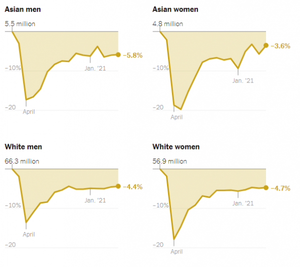 Σύμφωνα με έρευνα που ανέδειξαν οι New York Times, η επιστροφή στην εργασία έχει καθυστερήσει για τις Ισπανίδες και τις Αφροαμερικάνες, ενώ παρατηρείται μεταβολή στον αριθμό των απασχολούμενων ατόμων πριν από την πανδημία, ανά φυλή, εθνικότητα και φύλο.