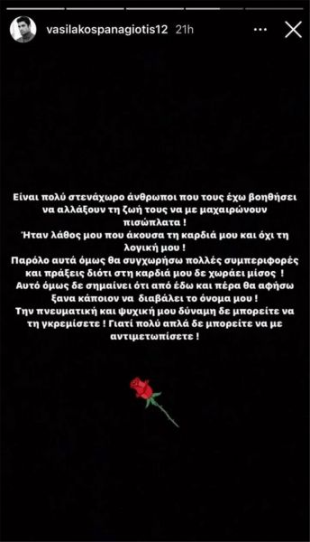Όπως έγραψε: «Είναι πολύ στενάχωρο άνθρωποι που τους έχω βοηθήσει να αλλάξουν την ζωή τους με μαχαιρώνουν πισώπλατα! Ήταν λάθος μου που άκουσα την καρδιά μου και όχι τη λογική μου! Παρόλα αυτά όμως θα συγχωρήσω πολλές συμπεριφορές και πράξεις, διότι στην καρδιά μου δεν χωράει μίσος! Αυτό όμως, δεν σημαίνει ότι από εδώ και πέρα θα αφήσω ξανά κάποιον να διαβάλει το όνομα μου! Την πνευματική και ψυχική μου δύναμη δεν μπορείτε να την γκρεμίσετε! Γιατί πολύ απλά δεν μπορείτε να με αντιμετωπίσετε!».
