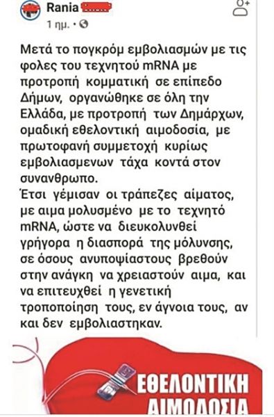 Αλλος αναρωτιέται: «Τι θα γίνει αν χρειάζομαι αίμα και μου κάνουν μετάγγιση από εμβολιασμένο; Θα μου μεταφέρει και το μπόλι;».