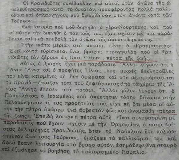 Στην τοποθέτησή του ο Δήμαρχος ανέφερε μεταξύ άλλων τον συμβολισμό αυτής της κίνησης αφού, η πρώτη μελέτη έργου του τρέχοντος έτους είναι η εν λόγω και σχετίζεται άμεσα με τον εορτασμό των 200 χρόνων από την Ελληνική Επανάσταση αλλά και με την ανάδειξη της τοπικής μας Ιστορίας. Κλείνοντας ευχαρίστησε όλους τους Δημοτικούς Συμβούλους για την στήριξη της πρότασης αυτής και ανάγνωσε τμήμα από τα γραφόμενα του Γιάννη Π. Κυριάκη στο βιβλίο του «ΤΟ ΧΩΡΙΟ ΜΟΥ (ΚΡΑΝΙΔΙΟΝ)» σχετικά με τους θρύλους και τις παραδώσεις που επικρατούσαν για την Πέτρα αυτή, το οποίο παραθέτουμε σε φωτογραφία που ακολουθεί.