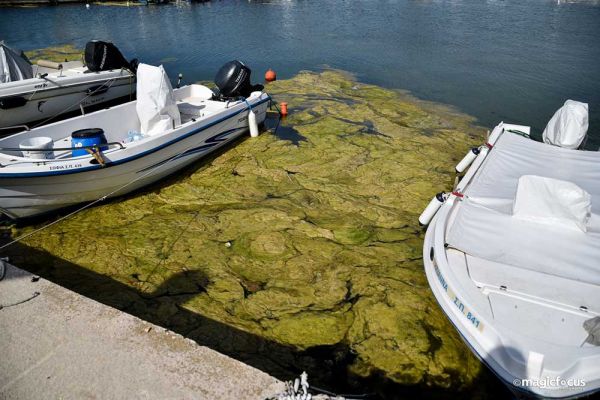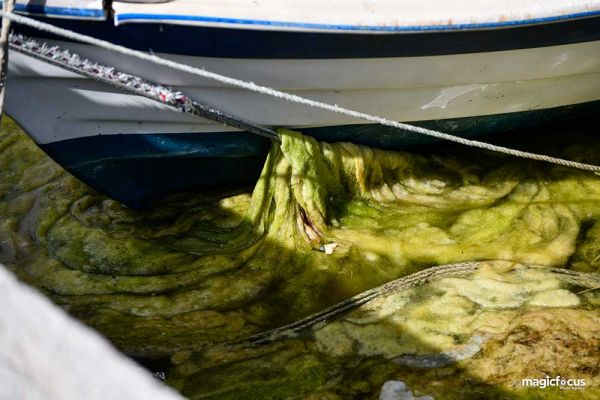 Η κρούστα αυτή οφείλεται σε φύκια, που σύμφωνα με ψαράδες της περιοχής, μπορεί να προκαλέσουν και ζημιά στις μηχανές των σκαφών, εάν η μάζα μπλεχτεί στις προπέλες.