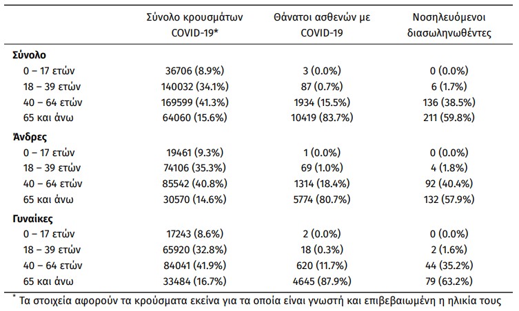 Οι νέοι θάνατοι ασθενών με COVID-19 είναι 18, ενώ από την έναρξη της επιδημίας έχουν καταγραφεί συνολικά 12.443 θάνατοι. Το 95.2% είχε υποκείμενο νόσημα ή/και ηλικία 70 ετών και άνω.