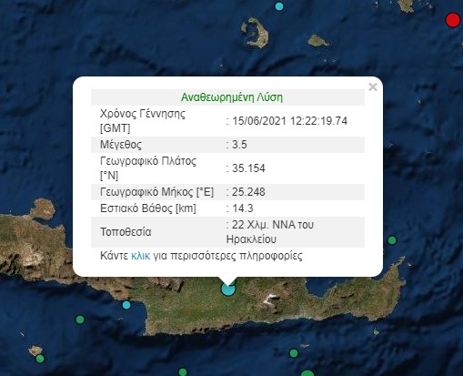 Σεισμική δόνηση σημειώθηκε στις 15:22 στο Ηράκλειο της Κρήτης.