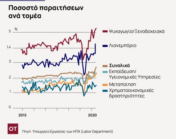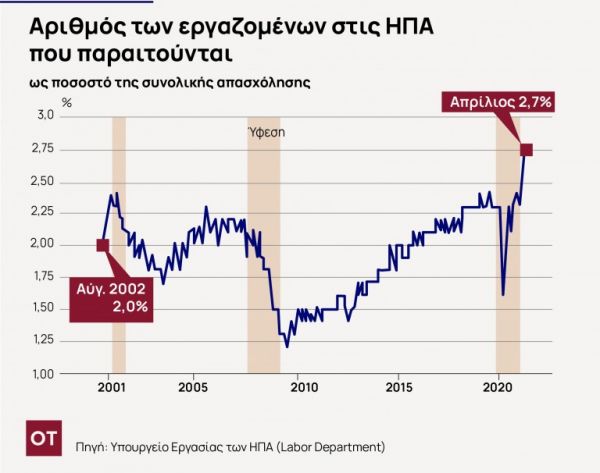 Από τις τελευταίες δύο δεκαετίες παρατηρήθηκε ότι φέτος όλο και περισσότεροι εργαζόμενοι στις ΗΠΑ παραιτούνται από τις δουλειές τους. Το γεγονός αυτό δείχνει την αισιοδοξία που επικρατεί μεταξύ των επαγγελματιών, ενώ, όμως, με τον τρόπο αυτό, επιβαρύνονται οι εταιρείες στον αγώνα τους για την οικονομική ανάκαμψη. Αυτό το κύμα παραιτήσεων σηματοδοτεί την αλλαγή από τις δύσκολες ημέρες της πανδημίας, όταν οι εργαζόμενοι επιθυμούσαν να νιώθουν ασφάλεια στον τομέα της εργασία τους, καθώς αντιμετώπιζαν εθνική υγειονομική και οικονομική κρίση. Τον Απρίλιο, το ποσοστό των Αμερικανών εργαζομένων που εγκατέλειψαν τις θέσεις εργασίας τους ανερχόταν στο 2,7%, σύμφωνα με το Υπουργείο Εργασίας, σημειώνοντας, έτσι, αύξηση από το 1,6% πριν ένα χρόνο, σημειώνοντας το υψηλότερο επίπεδο από το 2000.