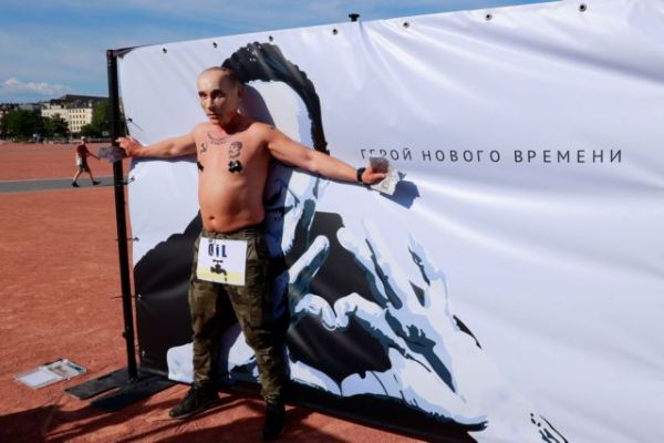 Φορώντας στρατιωτικό παντελόνι και γυμνός από τη μέση και πάνω –έτσι, δηλαδή, όπως έχει εμφανιστεί σε φωτογραφίες από τις διακοπές του ο αληθινός πρόεδρος– ο διαδηλωτής Αλεξάντερ Λιουμπούσκιν φορώντας μια μάσκα με την μορφή του Πούτιν καθόταν σε ένα παγκάκι μιας ηλιόλουστης πλατείας της Γενεύης, προσποιούμενος ότι πίνει βότκα.