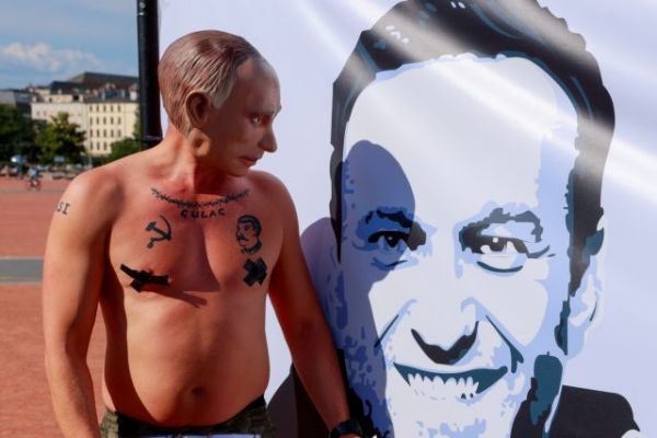 Φορώντας στρατιωτικό παντελόνι και γυμνός από τη μέση και πάνω –έτσι, δηλαδή, όπως έχει εμφανιστεί σε φωτογραφίες από τις διακοπές του ο αληθινός πρόεδρος– ο διαδηλωτής Αλεξάντερ Λιουμπούσκιν φορώντας μια μάσκα με την μορφή του Πούτιν καθόταν σε ένα παγκάκι μιας ηλιόλουστης πλατείας της Γενεύης, προσποιούμενος ότι πίνει βότκα