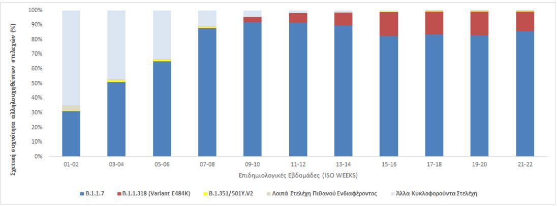 Η διαχρονική εξέλιξη της σχετικής συχνότητας των αλληλουχηθέντων δειγμάτων από τυχαία δειγματοληψία ανά είδος στελεχών, μέχρι και την εβδομάδα 22 απεικονίζεται στο παρακάτων διάγραμμα.