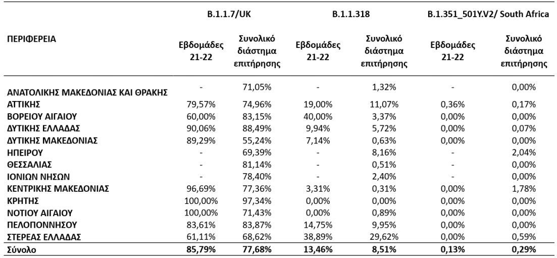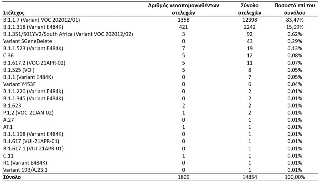 Από τα δείγματα αυτά, 24,64% αφορούν στο στέλεχος Β.1.1.7 (Variant VOC 202012/01), 61,12% στο B.1.1.318 (Variant E484K) και 3,32% στο B.1.351/501Y.V2 (Variant VOC 202012/02).