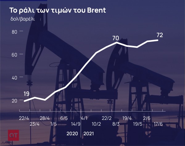 Οι τιμές του αργού πετρελαίου (Brent) διαμορφώνονται πλέον πάνω από τα 72 δολ το βαρέλι, ενώ οι τιμές του αμερικανικού αργού (WTI) έχουν σπάσει κι αυτές το φράγμα των 70 δολ. Πρόκειται για σημαντική αύξηση της τάξης του 40% από τις αρχές του έτους που πλήττει την τσέπη των νοικοκυριών και ανεβάζει τον πληθωρισμό περιπλέκοντας το έργο των κεντρικών τραπεζών.