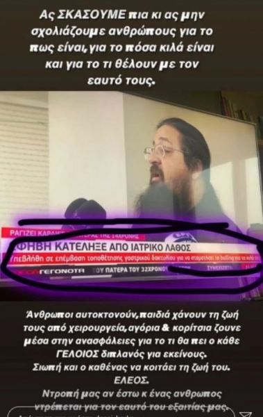 Η παρουσιάστρια του MEGA με ανάρτησή της στα Instastories αναφέρθηκε στο τραγικό γεγονός και ζήτησε να σταματήσουμε να σχολιάζουμε ανθρώπους για τα κιλά τους. Θυμίζουμε ότι η νεαρή μαθήτρια από τη Θεσσαλονίκη δεχόταν αρνητικά σχόλια και bullying για το βάρος της και γι’ αυτό πήρε την απόφαση να υποβληθεί σε χειρουργείο. Όμως, νόσησε από περιτονίτιδα εξαιτίας του δακτυλίου και έφυγε από τη ζωή.
