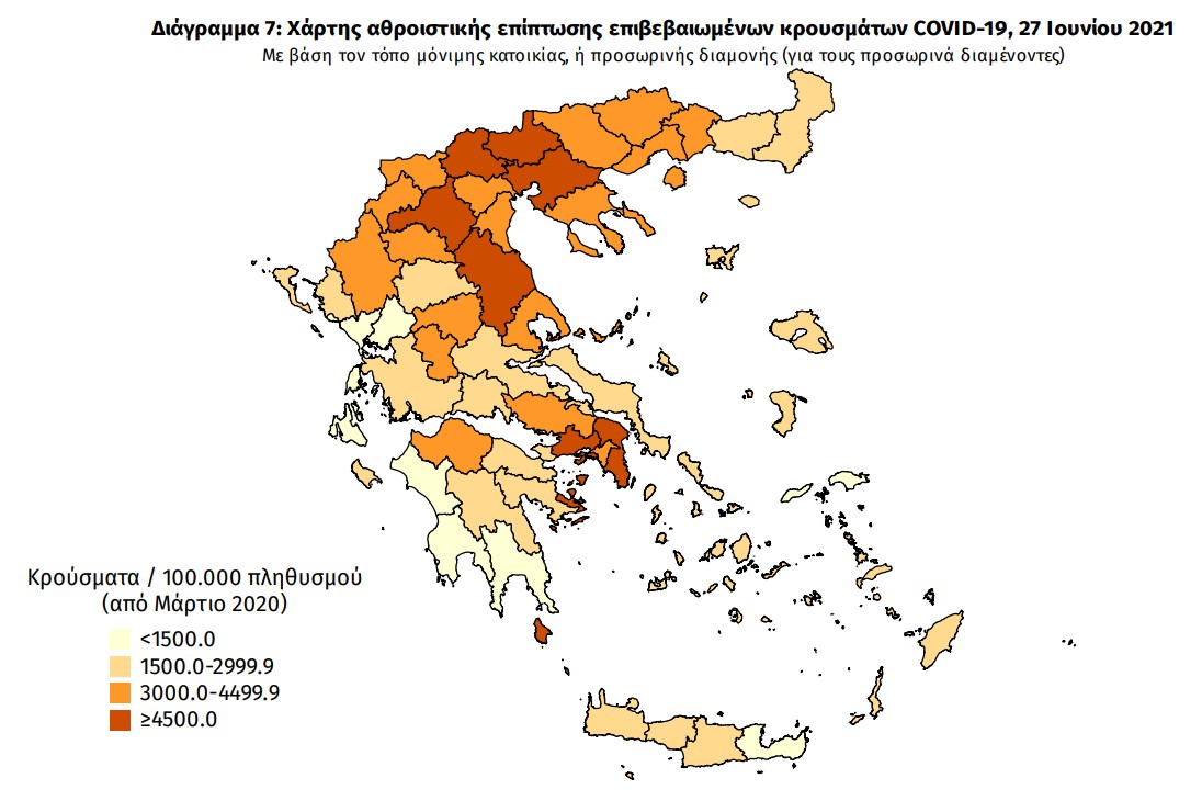 Ο χάρτης αποτυπώνει τη γεωγραφική κατανομή των συνολικών κρουσμάτων COVID-19 (από την αρχή της επιδημίας) ανά Περιφερειακή Ενότητα της χώρας, με βάση την δηλωθείσα διεύθυνση μόνιμης κατοικίας του ασθενούς, ή τη διεύθυνση προσωρινής διαμονής για τους τουρίστες και άλλους προσωρινά διαμένοντες στην Ελλάδα. Συμπεριλαμβάνονται τόσο κρούσματα με ιστορικό ταξιδίου (“εισαγόμενα”) όσο και κρούσματα με πιθανή εγχώρια μετάδοση.
