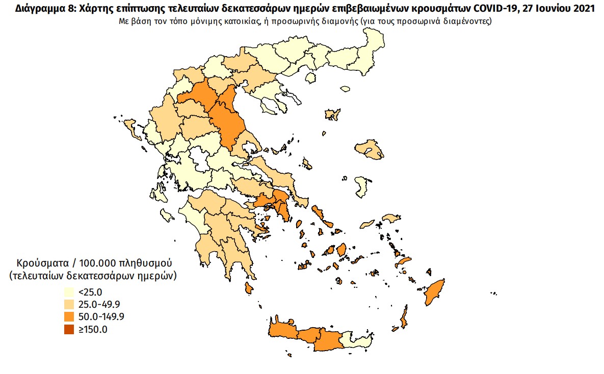 Με βάση τα επιβεβαιωμένα κρούσματα των τελευταίων 7 ημερών, 54θεωρούνται σχετιζόμενα με ταξίδι από το εξωτερικό και 646 είναι σχετιζόμενα με ήδη γνωστό κρούσμα.
