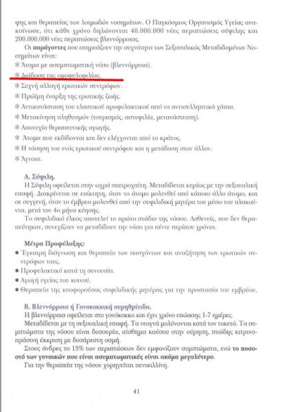 Σύμφωνα με την διατύπωση στο εγχειρίδιο Υγιεινή- Μικροβιολογία της Γ’ Λυκείου των ΕΠΑΛ περιλαμβανόταν και ο παράγοντας «Διάδοση της ομοφυλοφιλίας».