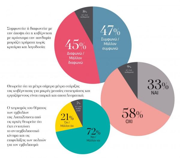 Σύμφωνα με την Palmos Analysis το 72% θεωρεί ότι ο χειρισμός του θέματος των εμβολίων της AstraZeneca από τις Αρχές έχει ενίσχυσε τους αρνητές ή έστω όσους είχαν επιφυλάξεις για τα εμβόλια. Μόλις 21% πιστεύουν ότι δεν υπάρχουν ευθύνες των Αρχών. Tο 65% των ερωτηθέντων σε δημοσκόπηση της Marc τάσσεται υπέρ της υποχρεωτικότητας του εμβολιασμού για ορισμένες επαγγελματικές ομάδες, ενώ ζητούν απομάκρυνση ή μετάθεση για τους «αρνητές».