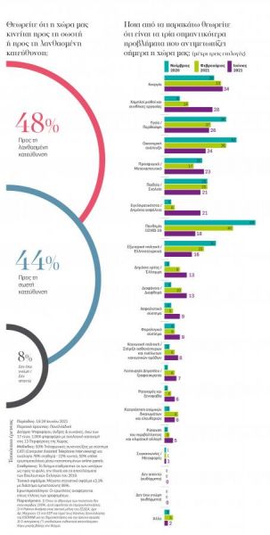 Το 48% των πολιτών θεωρούν πως η χώρα κινείται σε λάθος κατεύθυνση, ενώ το 35% απαντάει πως η Ν.Δ., κατά τη διάρκεια της διακυβέρνησής της, τα έχει πάει χειρότερα σε σχέση με τις προσδοκίες που είχε καλλιεργήσει πριν από τις εκλογές, με ένα 31% να θεωρεί πως δεν τα έχει πάει ούτε χειρότερα ούτε καλύτερα.