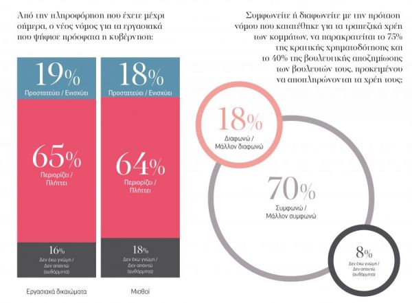 Σε ότι αφορά το νόμο Χατζηδάκη για τα εργασιακά το 65% απαντά ότι ο νέος νόμος περιορίζει και πλήττει τα εργασιακά δικαιώματα, έναντι του 19% που εκτιμά ότι τα προστατεύει. Επίσης το 64% θεωρεί ότι πλήττονται οι μισθοί ενώ το 18% πιστεύει ότι προστατεύονται.