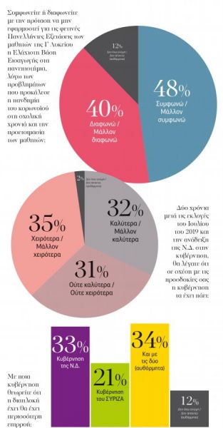 Επίσης θετικά, αν και οι απαντήσεις σχεδόν μοιράζονται (48% έναντι 40%), βλέπουν οι ερωτηθέντες την πρόταση του ΣΥΡΙΖΑ να μην εφαρμοστεί στις φετινές Πανελλαδικές εξετάσεις των μαθητών της Γ’ Λυκείου η ελάχιστη βάση εισαγωγής στα πανεπιστήμια λόγω των προβλημάτων που προκάλεσε η πανδημία στην εύρυθμη λειτουργία των σχολείων και την προετοιμασία των μαθητών.