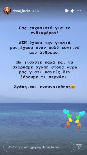 «Σας ευχαριστώ για το ενδιαφέρον. Δεν έχασα τη γιαγιά μου, έχασα έναν πολύ κοντινό μου άνθρωπο. Να είσαστε καλά και να σκορπάμε στους γύρω μας γιατί κανείς δεν ξέρουμε τι περνάει. Αγάπη και ενσυναίσθηση», σημείωσε η παρουσιάστρια του «Πάμε Δανάη», που αρκετές φορές έχει μιλήσει για το θάνατο και έχει περάσει τα δικά της μηνύματα για τη ζωή.
