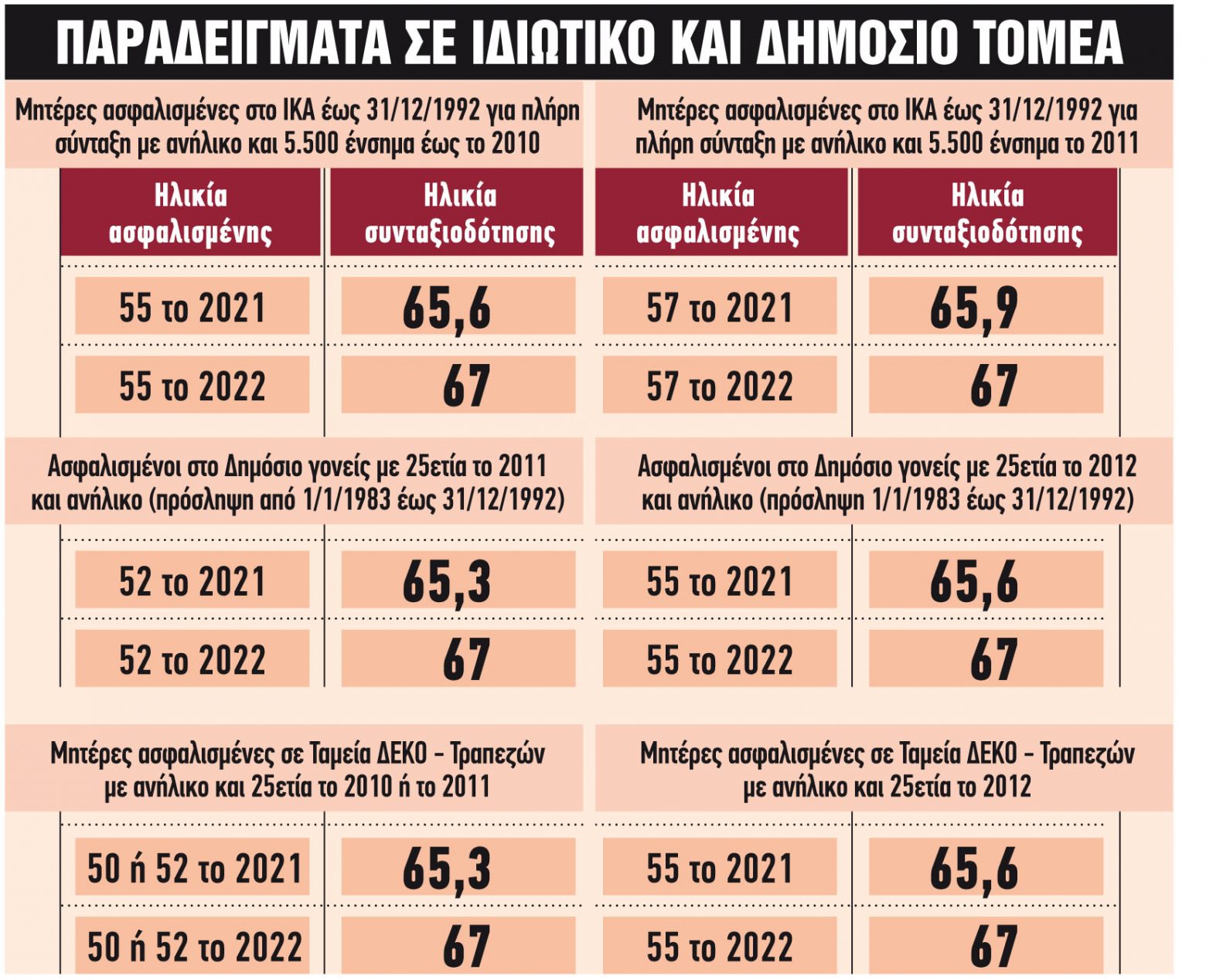 2. Ανδρες – γυναίκες με 25 έτη ασφάλισης και ανήλικο τέκνο το 2011, που έχουν γεννηθεί από Μάιο έως Δεκέμβριο του 1964, συνταξιοδοτούνται συμπληρώνοντας την ηλικία των 56 ετών και 9 μηνών.