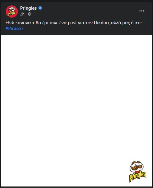 Σειρά πήρε η γνωστή εταιρεία Pringles με τα πατατάκια που ανήρτησε μία «άδεια» φωτογραφία με το σχόλιο ότι: «εδώ κανονικά θα έμπαινε ένα post για τον Πικάσο, αλλά μας έπεσε».