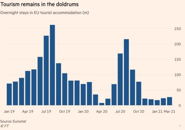 Αποδεικνύοντας την επιθυμία τους να προσελκύσουν τουρίστες, η Ισπανία και η Πορτογαλία τον Μάιο κατήργησαν τους περισσότερους περιορισμούς που προέβλεπαν τεστ και καραντίνα για τις αφίξεις από χώρες όπως το Ηνωμένο Βασίλειο. Η Ελλάδα έκανε το ίδιο για αφίξεις εμβολιασμένων τουριστών από 53 χώρες, συμπεριλαμβανομένης της Ρωσίας. Έκτοτε, τόσο το Ηνωμένο Βασίλειο όσο και η Ρωσία κατέγραψαν μεγάλη αύξηση στις λοιμώξεις που οφείλονται στην παραλλαγή «Δέλτα».