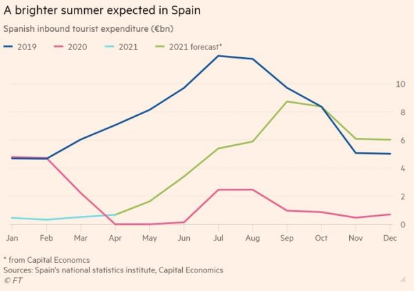 Σύμφωνα με τους οικονομολόγους, το πρόγραμμα εμβολιασμού της ΕΕ είναι ένας αγώνας για να σώσει την τουριστική περίοδο της περιοχής από την παραλλαγή Δέλτα. «Η καλύτερη απάντηση σε αυτήν την απειλή είναι η επιτάχυνση της εκστρατείας εμβολιασμού» σχολίασε ο Ραφαέλ Ντομνεχ της ισπανικής τράπεζας BBVA.