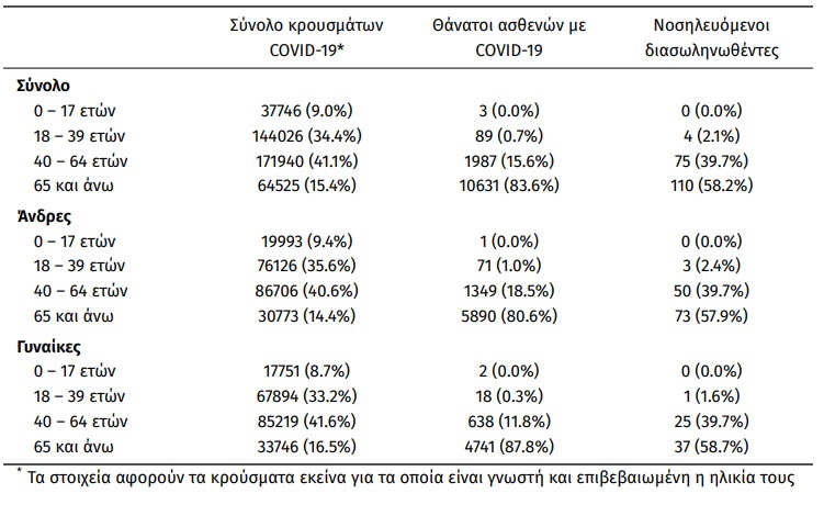 Οι νέοι θάνατοι ασθενών με COVID-19 είναι 4, ενώ από την έναρξη της επιδημίας έχουν καταγραφεί συνολικά 12.710 θάνατοι. Το 95.2% είχε υποκείμενο νόσημα ή/και ηλικία 70 ετών και άνω.