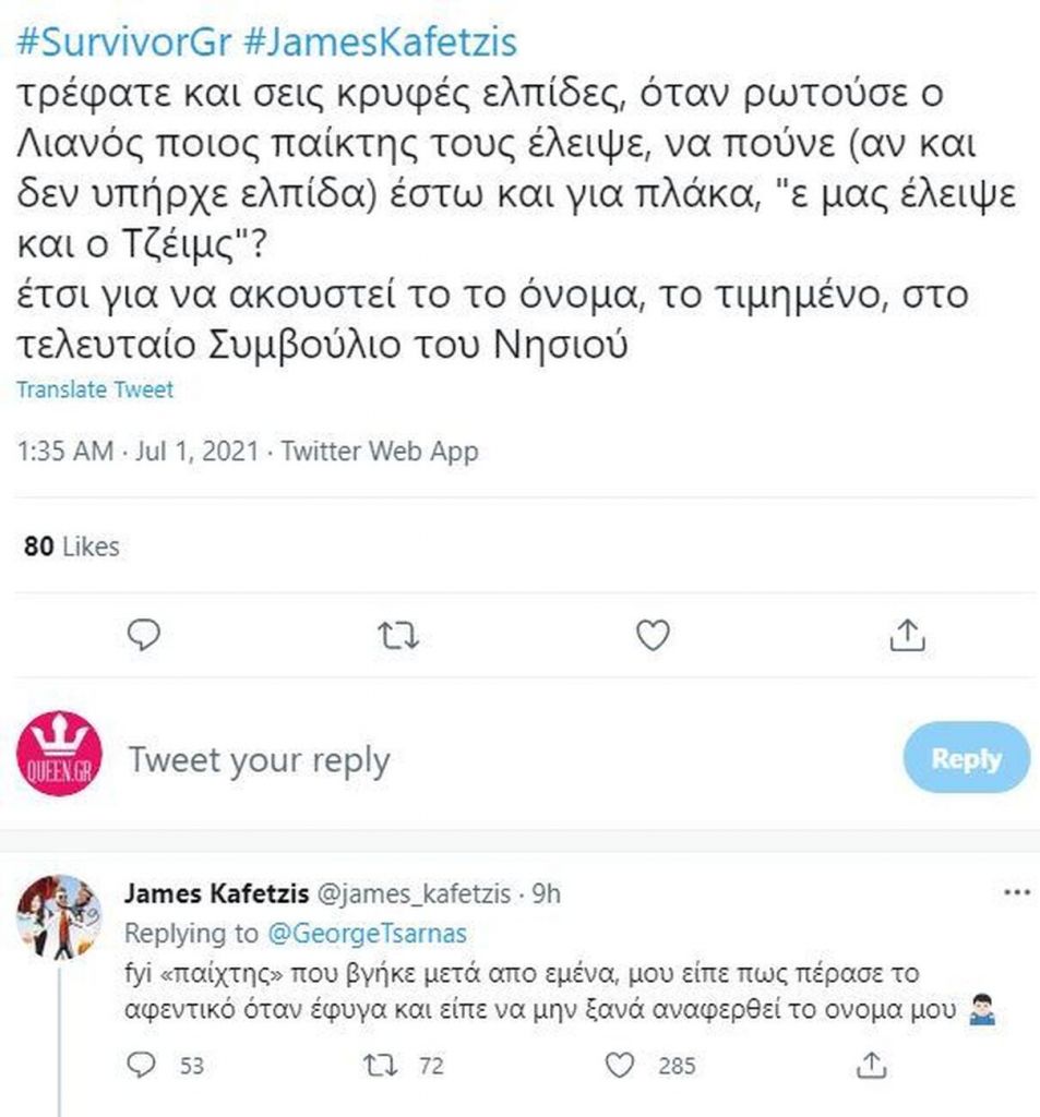Ένα παράξενο σχόλιο του Τζέιμς Καφετζή έκανε τον γύρο του Twitter δημιουργώντας ερωτηματικά για τους χειρισμούς της παραγωγής μετά την οικειοθελή του αποχώρηση από το παιχνίδι.