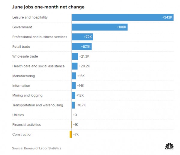 Το CNBC μελέτησε τις καθαρές αλλαγές ανά βιομηχανία για τις θέσεις εργασίας του Ιουνίου βάσει δεδομένων που περιέχονται στην έκθεση απασχόλησης της κυβέρνησης.