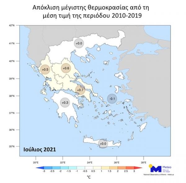 Στη Μακεδονία και την Κρήτη η μέση μέγιστη θερμοκρασία υπολογίστηκε ακριβώς ίση με τον μέσο όρο της περιόδου 2010-2019, ενώ στην υπόλοιπη ηπειρωτική χώρα οι αντίστοιχες τιμές ήσαν ελαφρώς υψηλότερες, μικρότερες όμως από ένα βαθμό Κελσίου πάνω από τα κανονικά για την εποχή επίπεδα.