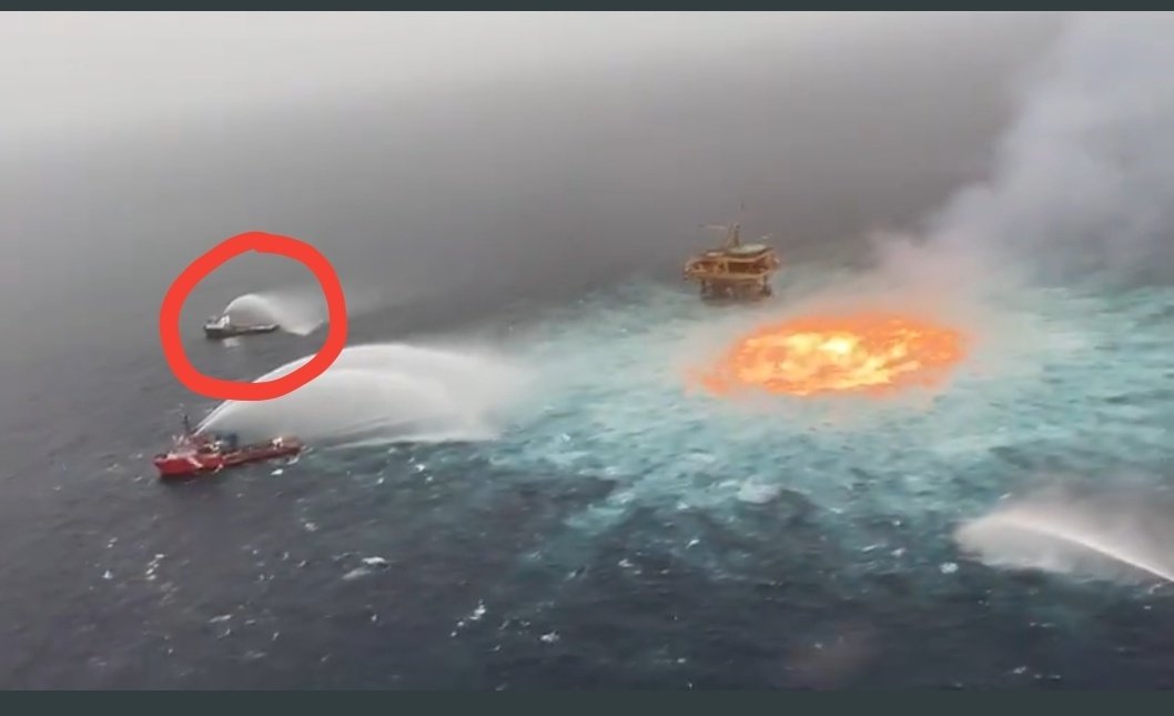Μεγάλες πορτοκαλί φλόγες που ξεπηδούν από το νερό μοιάζοντας με λιωμένη λάβα ονοματίστηκαν ως ένα «πύρινο μάτι» από χρήστες σε μέσα κοινωνικής δικτύωσης λόγω του κυκλικού σχήματος της φλόγας, που μαινόταν σε μικρή απόσταση από μια πλατφόρμα άντλησης πετρελαίου της Pemex.