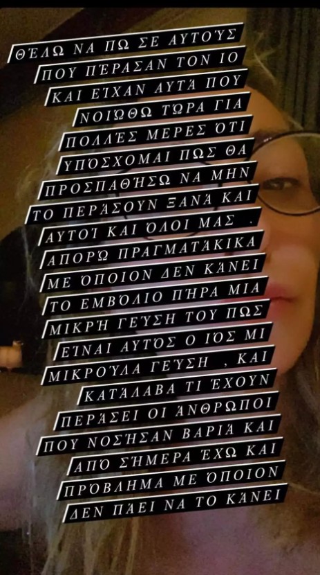 «Θέλω να πω σε αυτούς που πέρασαν τον ιο και είχαν αυτά που νιώθω τώρα για πολλές μέρες ότι θα προσπαθήσω να μην το περάσουν ξανά και αυτοί και όλοι μας. Απορώ πραγματικά με όποιον δεν κάνει το εμβόλιο. Πήρα μια μικρή γεύση του πως είναι αυτός ο ιός και κατάλαβα τι έχουν περάσει οι άνθρωποι που νόσησαν βαριά και από σήμερα έχω και πρόβλημα με όποιον δεν κάνει το εμβόλιο» και λίγο μετά συνέχισε σε νέα ανάρτηση.