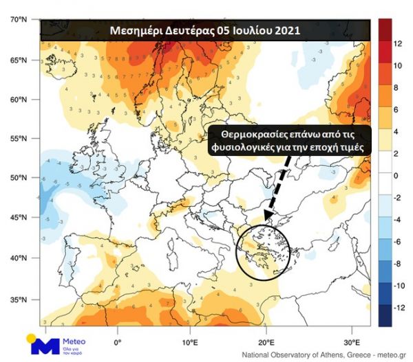 Η θερμοκρασία στη Θράκη και στην Ανατολική Μακεδονία θα κυμανθεί από 21 έως 34 βαθμούς Κελσίου, στην Κεντρική Μακεδονία από 21 έως 37, στη Δυτική Μακεδονία από 18 έως 32, στη Θεσσαλία από 23 έως 37, στην Ήπειρο από 19 έως 35, στη Στερεά Ελλάδα από 20 έως 36, στην Πελοπόννησο από 19 έως 36, στα νησιά του Ιονίου από 22 έως 34, στα νησιά του Βορείου Αιγαίου από 20 έως 32, στα νησιά του Ανατολικού Αιγαίου από 20 έως 35, στις Κυκλάδες από 20 έως 34, στα Δωδεκάνησα από 24 έως 33 και στην Κρήτη από 17 έως 33 βαθμούς Κελσίου.