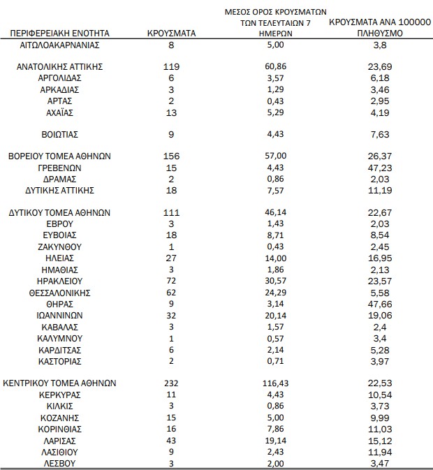 Όπως κάθε μέρα, έτσι και σήμερα η Αττική κατακτά την αρνητική πρωτιά των κρουσμάτων, ενώ ακολουθεί η Θεσσαλονίκη. Την ίδια στιγμή, «πονοκέφαλο» στους ειδικούς προκαλούν αρκετές ακόμα περιοχές της Ελλάδας