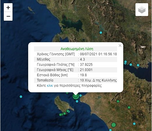 Σύμφωνα με την ανακοίνωση του Γεωδυναμικού Ινστιτούτου του Αστεροσκοπείου Αθηνών, ο σεισμός καταγράφηκε σήμερα Πέμπτη στις 04:16 και το επίκεντρό του εντοπίστηκε σε απόσταση 10 χιλιομέτρων δυτικά της Κυλλήνης.