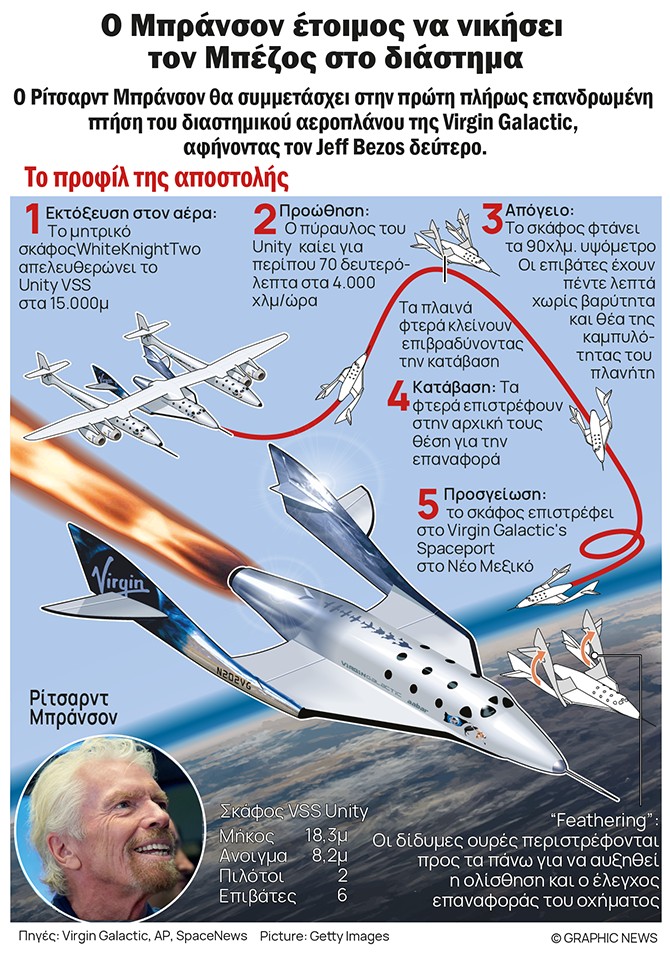 Ο μεγιστάνας του ομίλου Virgin Ρίτσαρντ Μπράνσον φιλοδοξεί να γίνει αυτή την Κυριακή ο πρώτος δισεκατομμυριούχος που πετά στο Διάστημα με το δικό του σκάφος, λίγες ημέρες πριν από το αντίστοιχο εγχείρημα του Τζεφ Μπέζος της Άμαζον.