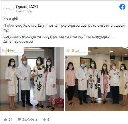 «It’s a girl! Η ηθοποιός Χριστίνα Σέιχ πήρε εξιτήριο σήμερα μαζί με το υγιέστατο μωράκι της. Ευχόμαστε ολόψυχα να τους ζήσει και να είναι γερή και ευτυχισμένη.