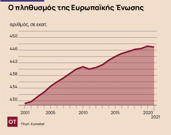 Συγκεκριμένα, ο πληθυσμός της ΕΕ μειώθηκε από 447,3 εκατομμύρια την 1η Ιανουαρίου 2020 σε 447 εκατομμύρια την 1η Ιανουαρίου 2021, πιθανότατα λόγω των επιπτώσεων της πανδημίας COVID-19.